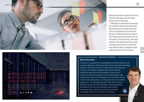 Drescher is recognised for unparalleled technical expertise and creative solutions at the intersection of real estate and technology analytics . His over 20 years ’ IT experience in the financial services , technology and global telecommunications industries and extensive knowledge of enterprise IT systems has been leveraged to successfully design , plan and execute the fit-out and migration of more than 30 data centers and trading floors , totaling more than one million square feet . As a founding partner of the firm ’ s Critical Facilities Group , Drescher provides strategic planning and advisory services pertaining to data centers , interconnection , cloud infrastructures and other technology-intensive real estate transactions .