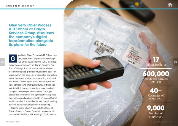 G len Seto , Chief Process & IT Officer has only been with Cargo Services Group ( CSG ) for seven months ( CSG includes major companies such as : Cargo Services Far East , CN Logistics Ltd , and more ). He states : “ e-commerce has grown so much in the past few years , which has caused considerable disruption to our customers in the manufacturing and retail industries . Currently we are in a volatile , uncertain , complex and ambiguous ( VUCA ) business era , in which many corporations have created complex and competitive markets . Through digital transformation and optimisation , logistics operations can be developed to be more efficient and innovative . It was this mindset that piqued my interest to be involved back in the industry .”