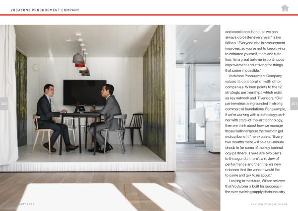 Vodafone Procurement Company values its collaboration with other companies . Wilson points to the 12 strategic partnerships which exist as key network and IT vendors . “ Our partnerships are grounded in strong commercial foundations . For example , if we ’ re working with a technology partner with state-of-the-art technology , then we think about how we manage those relationships so that we both get mutual benefit ,” he explains . “ Every two months there will be a 90-minute check-in for some of the key technology partners . There are two parts to the agenda ; there ’ s a review of performance and then there ’ s new releases that the vendor would like to come and talk to us about .”