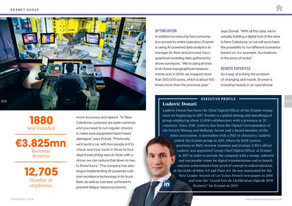 Number of employees more accuracy and speed . “ In New Caledonia , cyclones are quite common , and you need to run regular checks to make sure equipment hasn ’ t been damaged ,” says Donati . “ Previously , we ’ d send a car with two people in it to check and hear back in three to four days if everything was ok . Now , with a drone , we can reduce that down to two to three hours .” The company has also begun implementing AI-powered collision avoidance technology in its truck fleet , as well as overseer software to prevent fatigue-based accidents .