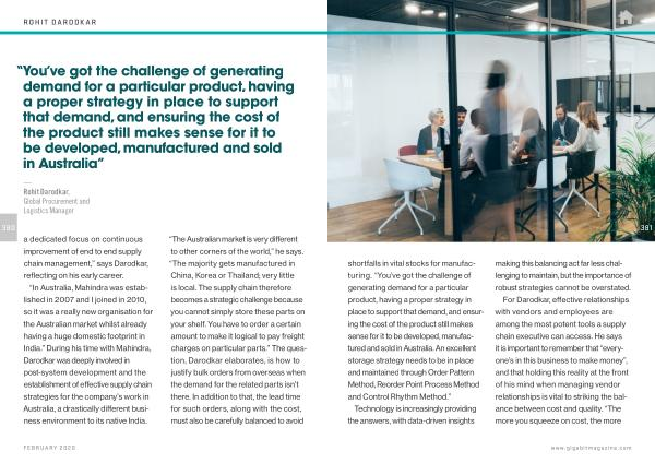“ In Australia , Mahindra was established in 2007 and I joined in 2010 , so it was a really new organisation for the Australian market whilst already having a huge domestic footprint in India .” During his time with Mahindra , Darodkar was deeply involved in post-system development and the establishment of effective supply chain strategies for the company ’ s work in Australia , a drastically different business environment to its native India .