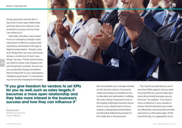 Internally , Darodkar says a keen focus on managing change is also imperative to effective supply chain operations , particularly in the age of digital transformation . “ People come to do things their own way , and there ’ s always a resistance to learn new things ,” he says . “ As the world evolves , you need to evolve , and change is the only thing that ’ s constant . As soon as you accept that change and believe that it ’ s important to your organisation , resistance goes down .” In manufacturing , it is not only changing technologies