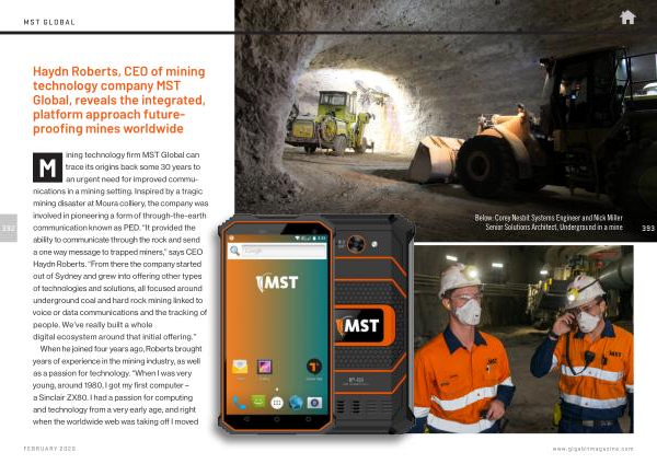 M ining technology firm MST Global can trace its origins back some 30 years to an urgent need for improved communications in a mining setting . Inspired by a tragic mining disaster at Moura colliery , the company was involved in pioneering a form of through-the-earth communication known as PED . “ It provided the ability to communicate through the rock and send a one way message to trapped miners ,” says CEO Haydn Roberts . “ From there the company started out of Sydney and grew into offering other types of technologies and solutions , all focused around underground coal and hard rock mining linked to voice or data communications and the tracking of people . We ’ ve really built a whole digital ecosystem around that initial offering .”