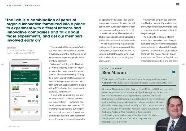 Benjamin Maxim joined MSU Federal Credit Union in 2007 and currently serves as Assistant Vice President of Digital Strategy and Innovation . He is responsible for assessing emerging business trends and technologies , facilitating innovation throughout the Credit Union , and providing strategic direction for existing and future digital channels . Maxim began work initially as a Web Developer and in 2014 , he became E-Commerce Manager before moving into roles including Assistant Vice President of Programming and Development and Assistant Vice President of Software Development . He earned a bachelor ’ s degree from Michigan State University . technologymagazine . com