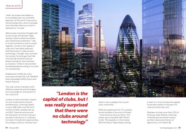 With private investment fraught with access issues with growth-stage startups , Sidorov knew the answer was institutional investment : “ I like to invite my friends in tech to invest together . London is the capital of clubs , but I was really surprised that there were no clubs around technology . I thought : why not build the London Technology Club ? We now have 85 members and are always looking for new members as investors . I ' d like to have another hundred people knocking on my door for membership .”
