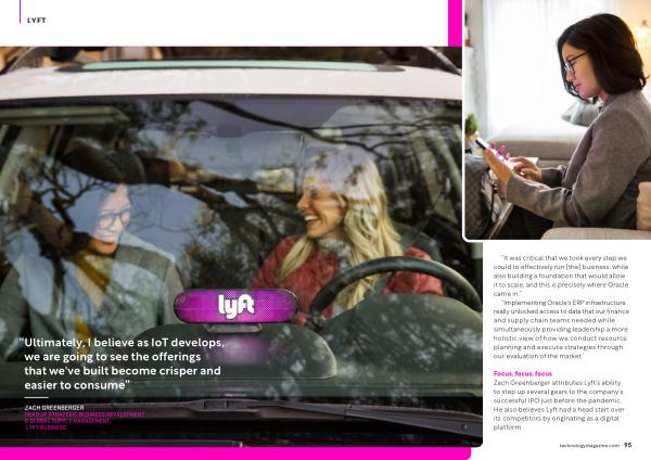 Focus , focus , focus Zach Greenberger attributes Lyft ’ s ability to step up several gears to the company ’ s successful IPO just before the pandemic . He also believes Lyft had a head start over its competitors by originating as a digital platform . technologymagazine . com 95