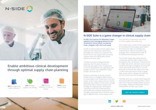 Pharma companies of all sizes use the N-SIDE Suite , an intelligent SaaS solution , to avoid supply chain bottlenecks , minimise waste , control costs , reduce time-to-market , speed up the initiation of new trials , manage production plans , monitor supply chain strategy for ongoing trials , and support commercial launches . Pharmaceutical and healthcare company Sanofi started a strategic partnership with N-SIDE five years ago to digitalise their clinical supply chain .