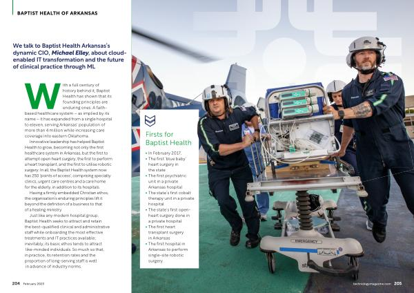 We talk to Baptist Health Arkansas ’ s dynamic CIO , Michael Elley , about cloudenabled IT transformation and the future of clinical practice through ML
