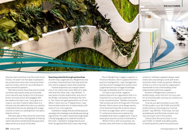 “ To have a very hostile , negative relationship with an organisation that is so important to our business seemed to me to be counterintuitive ,” Whittle comments . “ We ' ve done all sorts of things with Thomson Reuters . We ' ve done some design sprints , some brainstorming . We ' ve done a piece for them at Legal Geek , which is a legal IT conference where we looked at the metadata they had on judgements . They ' d never given anyone access to that before .” “ Where it fits in with our business , we will also work with them to help develop solutions . Software suppliers always need clients who are willing to work with them , and that ' s what I mean by partner . While all of that is a cost to me and my organisation , the benefit to me is the building of the relationships within the supplier .”