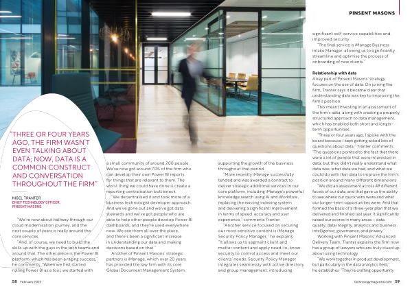 Relationship with data A key part of Pinsent Masons ’ strategy focuses on the use of data . On joining the firm , Tranter says it became clear that understanding data was key to improving the firm ’ s position .