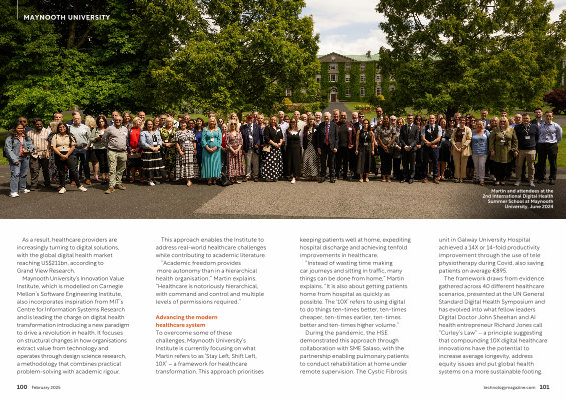 Maynooth University ’ s Innovation Value Institute , which is modelled on Carnegie Mellon ’ s Software Engineering Institute , also incorporates inspiration from MIT ’ s Centre for Information Systems Research and is leading the charge on digital health transformation introducing a new paradigm to drive a revolution in health . It focuses on structural changes in how organisations extract value from technology and operates through design science research , a methodology that combines practical problem-solving with academic rigour .