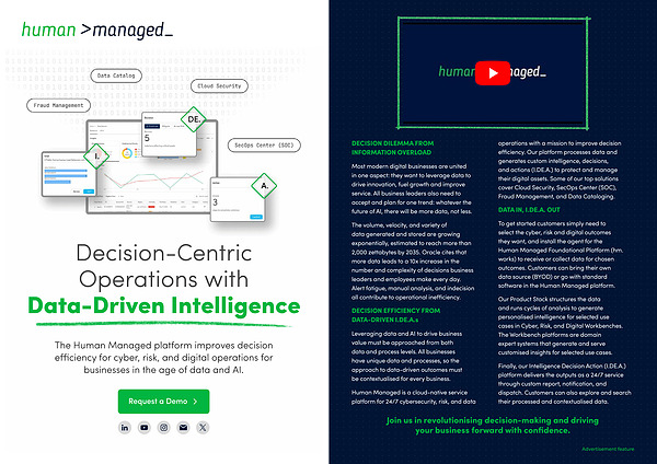 Human Managed is a cloud-native service platform for 24 / 7 cybersecurity , risk , and data operations with a mission to improve decision efficiency . Our platform processes data and generates custom intelligence , decisions , and actions ( I . DE . A .) to protect and manage their digital assets . Some of our top solutions cover Cloud Security , SecOps Center ( SOC ), Fraud Management , and Data Cataloging .