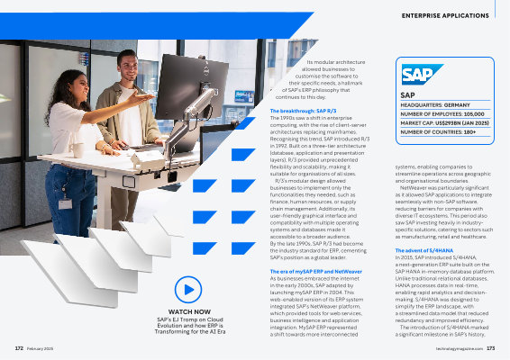 The breakthrough : SAP R / 3 The 1990s saw a shift in enterprise computing , with the rise of client-server architectures replacing mainframes . Recognising this trend , SAP introduced R / 3 in 1992 . Built on a three-tier architecture ( database , application and presentation layers ), R / 3 provided unprecedented flexibility and scalability , making it suitable for organisations of all sizes .