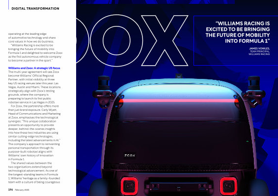 For Zoox , the partnership offers more than just brand exposure . Carly Wyatt , Head of Communications and Marketing at Zoox , emphasises the technological synergies : “ This unique collaboration presents an opportunity to provide deeper , behind-the-scenes insights into how these two industries are using similar cutting-edge technologies , including the latest advancements in AI .” The company ’ s approach to reinventing personal transportation through its purpose-built robotaxi aligns with Williams ’ own history of innovation in Formula 1 .