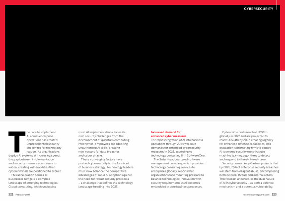 Increased demand for enhanced cyber measures The rapid integration of AI into business operations through 2024 will drive demands for enhanced cybersecurity measures in 2025 , according to technology consulting firm SoftwareOne . The Swiss-headquartered software management company , which provides technology consulting services to enterprises globally , reports that organisations face mounting pressure to balance technological innovation with security requirements as AI becomes embedded in core business processes .