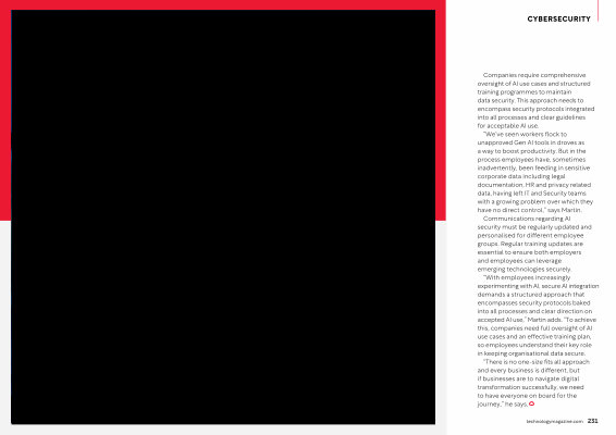 “ With employees increasingly experimenting with AI , secure AI integration demands a structured approach that encompasses security protocols baked into all processes and clear direction on accepted AI use ,” Martin adds . “ To achieve this , companies need full oversight of AI use cases and an effective training plan , so employees understand their key role in keeping organisational data secure .
