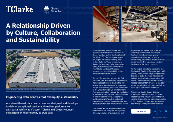 A state-of-the-art data centre campus , designed and developed to deliver exceptional service and resilient performance , with sustainability at it ’ s core . TClarke and Green Mountain collaborate on their journey to LON East .
