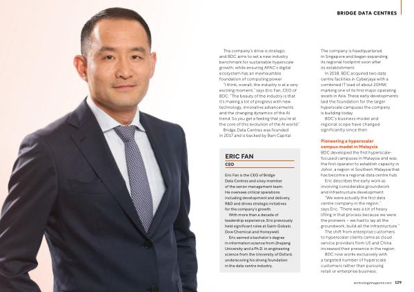 Eric Fan is the CEO of Bridge Data Centres and a key member of the senior management team. He oversees critical operations including development and delivery, R & D and drives strategic initiatives for the company’ s growth.