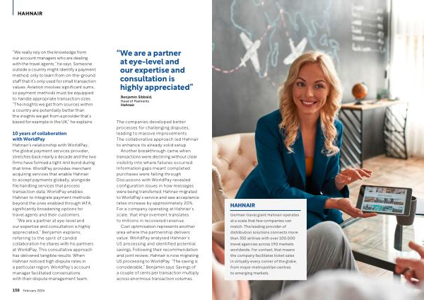 10 years of collaboration with WorldPay Hahnair’ s relationship with WorldPay, the global payment services provider, stretches back nearly a decade and the two firms have formed a tight-knit bond during that time. WorldPay provides merchant acquiring services that enable Hahnair to accept payments globally, alongside file handling services that process transaction data. WorldPay enables Hahnair to integrate payment methods beyond the ones enabled through IATA, significantly broadening options for travel agents and their customers.
