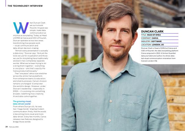 W hen Duncan Clark set out to build Flourish, his goal was simple: make data communication as intuitive as storytelling. Today, as Head of EMEA at Canva and CEO of Flourish, Duncan operates across two areas transforming how people work – visual communication and data‐driven decision‐making.