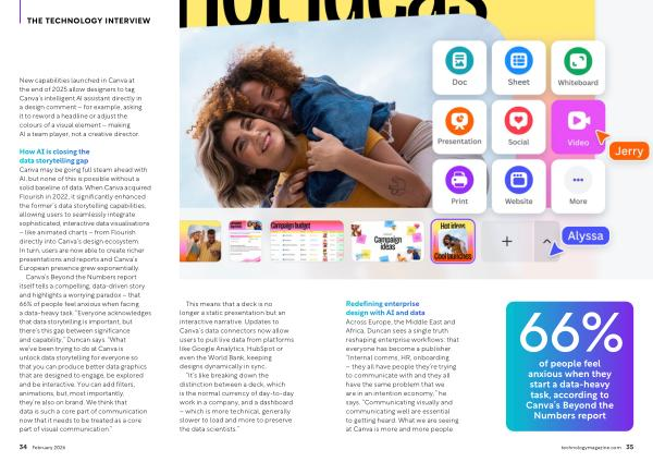 Redefining enterprise design with AI and data Across Europe, the Middle East and Africa, Duncan sees a single truth reshaping enterprise workflows: that everyone has become a publisher.“ Internal comms, HR, onboarding – they all have people they’ re trying to communicate with and they all have the same problem that we are in an intention economy,” he says.“ Communicating visually and communicating well are essential to getting heard. What we are seeing at Canva is more and more people