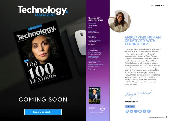 One of my favourite things about technology is how it enables – not stifles – creativity. The February edition of Technology Magazine epitomises that, from Canva’ s Duncan Clark discussing how data and AI amplify human flair to our Top 10 Chief Digital Officers, which celebrates leaders across technology and their forward thinking. Also featured in this issue is a spotlight on NVIDIA as it passes a staggering US $ 5tn valuation in an age of edge computing, NETSCOUT on ensuring security compliance and a guide on how to build a resilient organisation with clarity and execution with Thai Vong, this month’ s cover star. Enjoy the issue.