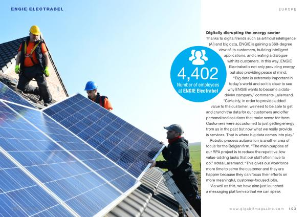 Digitally disrupting the energy sector Thanks to digital trends such as artificial intelligence ( AI ) and big data , ENGIE is gaining a 360-degree view of its customers , building intelligent applications , and creating a dialogue with its customers . In this way , ENGIE Electrabel is not only providing energy , but also providing peace of mind .