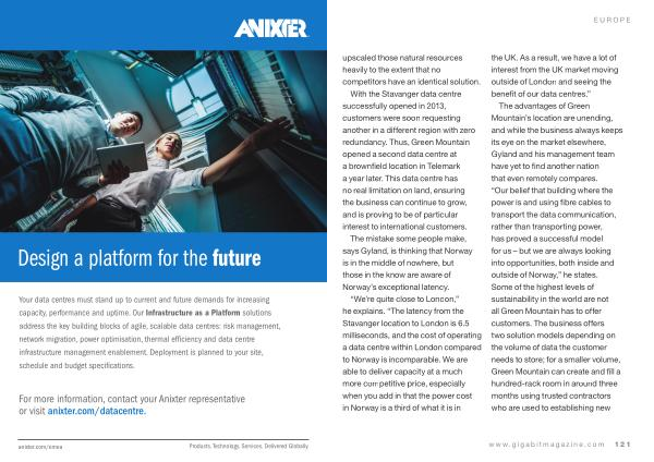The advantages of Green Mountain ’ s location are unending , and while the business always keeps its eye on the market elsewhere , Gyland and his management team have yet to find another nation that even remotely compares . “ Our belief that building where the power is and using fibre cables to transport the data communication , rather than transporting power , has proved a successful model for us – but we are always looking into opportunities , both inside and outside of Norway ,” he states . Some of the highest levels of sustainability in the world are not all Green Mountain has to offer customers . The business offers two solution models depending on the volume of data the customer needs to store ; for a smaller volume , Green Mountain can create and fill a hundred-rack room in around three months using trusted contractors who are used to establishing new