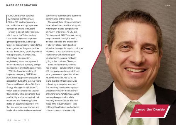 In his 30-year career , Dionisio has created IT solutions for Fortune 500 companies and many state and local government agencies . When he joined NAES in July 2015 , he found that the infrastructure was not entirely ‘ enterprise standard .’ The relatively new leadership team presented him with the challenge of transforming NAES into a leaner , more agile organization while retaining the core values that had made it the industry leader – and not forgetting today ’ s top businesscritical concern , cybersecurity .