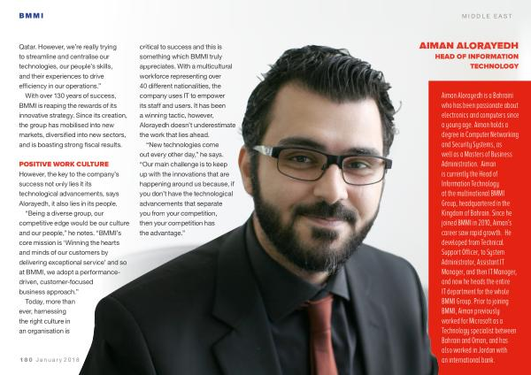 Aiman Alorayedh is a Bahraini who has been passionate about electronics and computers since a young age . Aiman holds a degree in Computer Networking and Security Systems , as well as a Masters of Business Administration . Aiman is currently the Head of Information Technology at the multinational BMMI Group , headquartered in the Kingdom of Bahrain . Since he joined BMMI in 2010 , Aiman ’ s career saw rapid growth . He developed from Technical Support Officer , to System Administrator , Assistant IT Manager , and then IT Manager , and now he heads the entire IT department for the whole BMMI Group . Prior to joining BMMI , Aiman previously worked for Microsoft as a Technology specialist between Bahrain and Oman , and has also worked in Jordan with an international bank .