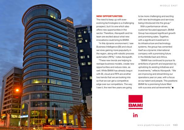 “ BMMI has continued to pursue its ambitions of growth and expansion by upholding its existing initiatives and investments ,” reflects Alorayedh . “ We are improving and streamlining our operations year on year , with a focus on our talent and people . This positions BMMI for a promising future filled with success and achievements .” www . gigabitmagazine . com 183