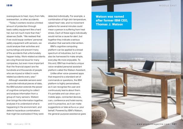 Although wearable sensors exist to provide individual pieces of data , the IBM solution extends the power of cognitive computing to collect and analyse information from a group of many sensors . Watson then brings the information together , analyses it to understand what is happening in the environment , and detects hazardous combinations that might be overlooked if they were detected individually . For example , a combination of high skin temperature , raised heart rate , and no movement patterns for several minutes could mean a person is suffering from heat stress . Each of these signs individually would not be a cause for alert , but together they indicate a serious situation that warrants intervention .
