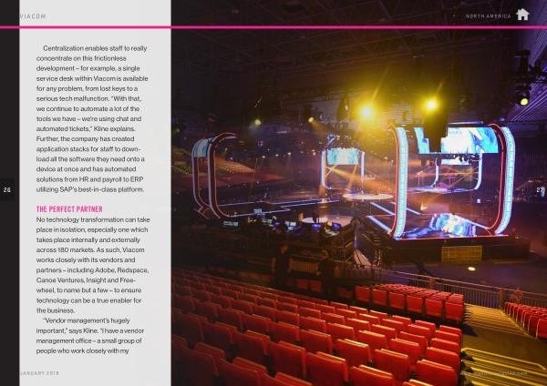 Centralization enables staff to really concentrate on this frictionless development – for example , a single service desk within Viacom is available for any problem , from lost keys to a serious tech malfunction . “ With that , we continue to automate a lot of the tools we have – we ’ re using chat and automated tickets ,” Kline explains . Further , the company has created application stacks for staff to download all the software they need onto a device at once and has automated solutions from HR and payroll to ERP utilizing SAP ’ s best-in-class platform .