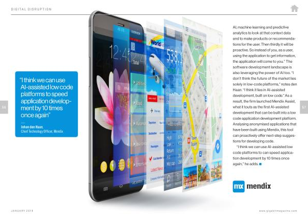 AI , machine learning and predictive analytics to look at that context data and to make products or recommendations for the user . Then thirdly it will be proactive . So instead of you , as a user , using the application to get information , the application will come to you .” The software development landscape is also leveraging the power of AI too . “ I don ’ t think the future of the market lies solely in low-code platforms ,” notes den Haan . “ I think it lies in AI-assisted development , built on low code .” As a result , the firm launched Mendix Assist , what it touts as the first AI-assisted development that can be built into a low code application development platform . Analysing anonymised applications that have been built using Mendix , this tool can proactively offer next-step suggestions for developing code .
