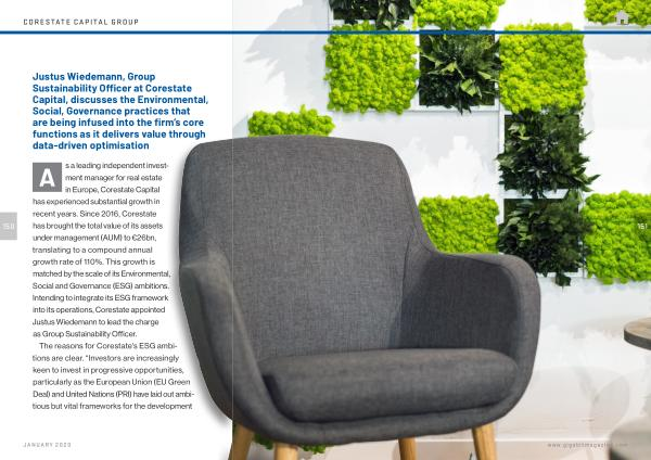 Justus Wiedemann , Group Sustainability Officer at Corestate Capital , discusses the Environmental , Social , Governance practices that are being infused into the firm ’ s core functions as it delivers value through data-driven optimisation