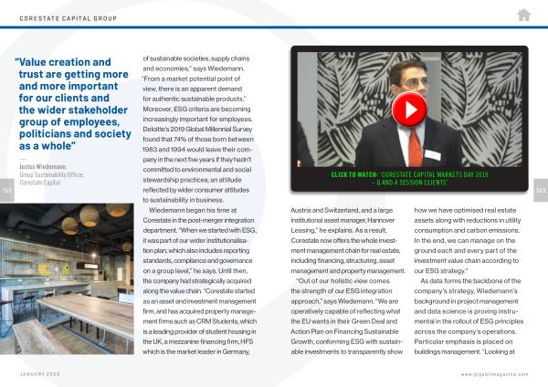 Wiedemann began his time at Corestate in the post-merger integration department . “ When we started with ESG , it was part of our wider institutionalisation plan , which also includes reporting standards , compliance and governance on a group level ,” he says . Until then , the company had strategically acquired along the value chain . “ Corestate started as an asset and investment management firm , and has acquired property management firms such as CRM Students , which is a leading provider of student housing in the UK , a mezzanine financing firm , HFS which is the market leader in Germany ,