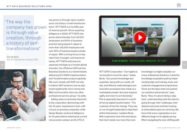 — Sharath Burla , CEO , NTT Data Business Solutions APAC has grown is through value creation and a rich history of self-transformations .” NTT DATA is in its 29th year of revenue growth . Since acquiring itelligence in 2009 , NTT DATA has grown phenomenally , from 32,000 employees and 80 % of business practice being based in Japan to more than 125,000 employees and over 65 % of business based outside of Japan . With a strong focus on key client-first , foresight , and teamwork values , NTT DATA embraces its Japanese heritage as a trusted global innovator . As a Platinum SAP partner , Business Solutions is a market leader , delivering S / 4 HANA Implementation and Transformation projects globally . “ We work closely with SAP not only to deliver SAP solutions , but we also invest significantly more money into R & D and Innovation than any other professional service group .” he adds .