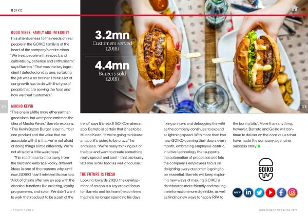 175 fixing printers and debugging the wifi ) as the company continues to expand at lightning speed . With more than two new GOIKO opening their doors every month , embracing employee-centric , intuitive technology that supports the automation of processes and lets the company ’ s employees focus on delighting every customer is going to be essential . Barreto will keep exploring new ways of making GOIKO ’ s dashboards more friendly and making the information more digestible , as well as finding new ways to “ apply RPA to the boring bits ”. More than anything , however , Barreto and Goiko will continue to deliver on the core values that have made the company a genuine success story .