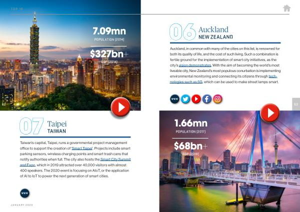 Taiwan ’ s capital , Taipei , runs a governmental project management office to support the creation of ‘ Smart Taipei ’. Projects include smart parking sensors , wireless charging points and smart trash cans that notify authorities when full . The city also hosts the Smart City Summit and Expo , which in 2019 attracted over 40,000 visitors with almost 400 speakers . The 2020 event is focusing on AIoT , or the application of AI to IoT to power the next generation of smart cities . JANUARY 2020