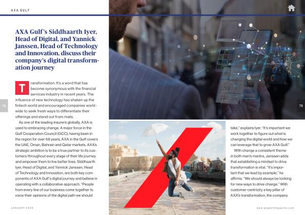 As one of the leading insurers globally , AXA is used to embracing change . A major force in the Gulf Cooperation Council ( GCC ), having been in the region for over 68 years , AXA in the Gulf covers the UAE , Oman , Bahrain and Qatar markets . AXA ’ s strategic ambition is to be a true partner to its customers throughout every stage of their life journey and empower them to live better lives . Siddhaarth Iyer , Head of Digital , and Yannick Janssen , Head of Technology and Innovation , are both key components of AXA Gulf ’ s digital journey and believe in operating with a collaborative approach . “ People from every line of our business come together to voice their opinions of the digital path we should