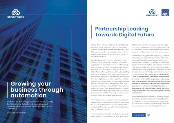 KeplerWorx , a strong reputation in providing IT services and solutions with expertise in Financial Services Industry ( FSI ) including compliance and security requirements . The team is committed to developing custom , streamlined solutions for customers to achieve their business objectives . When asked what made KeplerWorx the strategic partner of choice , Mr . Yannick Janssen , Head of Technology and Innovation at AXA Gulf responded , “ We conducted a review of AWS Cloud certified partners , KeplerWorx differentiated themselves in terms of strategic approach , strong technical capabilities , without forgetting an extensive experience in Financial Services . The best partner you can have is the one able to get the best of yourself and , with KeplerWorkx , the AXA Gulf Technology Acceleration team is innovating with a strong blended team .”