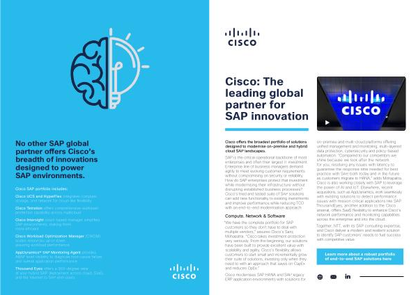 on-premise and multi-cloud platforms offering unified management and monitoring , multi-layered data protection , cybersecurity and policy-based automation . “ Compared to our competitors we shine because we look after the network for you ; resolving any issues with latency to guarantee the response time needed for best practice with SAP , both today and in the future as customers migrate to HANA ,” adds Mohapatra . Cisco is also working closely with SAP to leverage the power of AI and IoT . Elsewhere , recent acquisitions , such as AppDynamics , work seamlessly with existing solutions to detect performance issues with mission critical applications like SAP . ThousandEyes , another addition to the Cisco arsenal , offers SaaS flexibility to enhance Cisco ’ s network performance and monitoring capabilities across the enterprise and into the cloud . Together , NTT , with its SAP consulting expertise , and Cisco deliver a modern and resilient solution to identify SAP customers ’ needs to fuel success with competitive value .