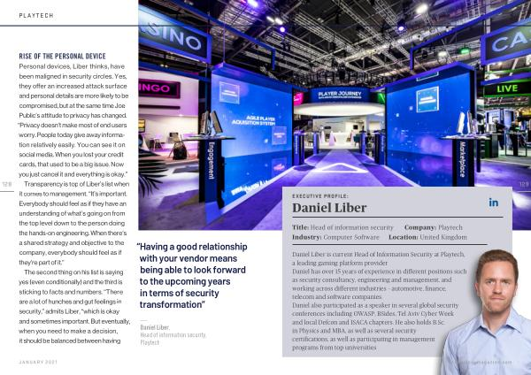 Daniel Liber is current Head of Information Security at Playtech , a leading gaming platform provider . Daniel has over 15 years of experience in different positions such as security consultancy , engineering and management , and working across different industries – automotive , finance , telecom and software companies . Daniel also participated as a speaker in several global security conferences including OWASP , BSides , Tel Aviv Cyber Week and local Defcon and ISACA chapters . He also holds B . Sc . in Physics and MBA , as well as several security certifications , as well as participating in management programs from top universities . technologymagazine . com
