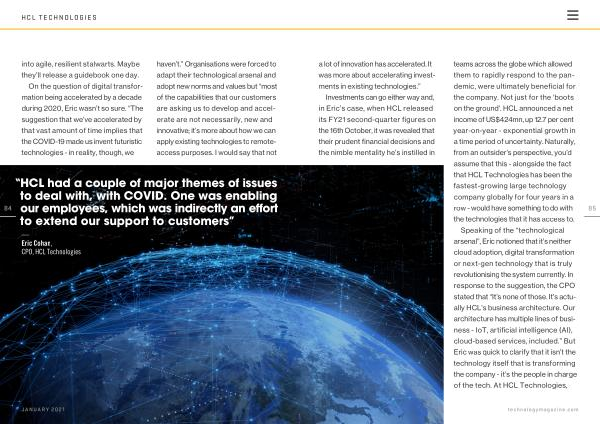 Investments can go either way and , in Eric ’ s case , when HCL released its FY21 second-quarter figures on the 16th October , it was revealed that their prudent financial decisions and the nimble mentality he ’ s instilled in teams across the globe which allowed them to rapidly respond to the pandemic , were ultimately beneficial for the company . Not just for the ‘ boots on the ground ’. HCL announced a net income of US $ 424mn , up 12.7 per cent year-on-year - exponential growth in a time period of uncertainty . Naturally , from an outsider ’ s perspective , you ’ d assume that this - alongside the fact that HCL Technologies has been the fastest-growing large technology company globally for four years in a row - would have something to do with the technologies that it has access to . Speaking of the “ technological arsenal ”, Eric notioned that it ’ s neither cloud adoption , digital transformation or next-gen technology that is truly revolutionising the system currently . In response to the suggestion , the CPO stated that “ It ’ s none of those . It ’ s actually HCL ’ s business architecture . Our architecture has multiple lines of business - IoT , artificial intelligence ( AI ), cloud-based services , included .” But Eric was quick to clarify that it isn ’ t the technology itself that is transforming the company - it ’ s the people in charge of the tech . At HCL Technologies ,