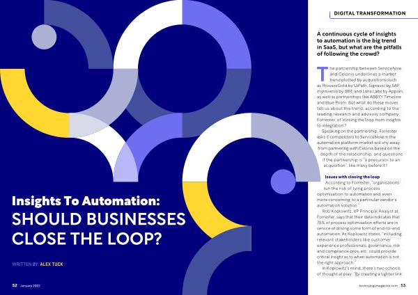 The partnership between ServiceNow and Celonis underlines a market trend plotted by acquisitions such as ProcessGold by UiPath , Signavio by SAP , myInvenio by IBM , and Lana Labs by Appian , as well as partnerships like ABBYY Timeline and Blue Prism . But what do these moves tell us about the trend , according to the leading research and advisory company , Forrester , of ‘ closing the loop from insights to integration ’?