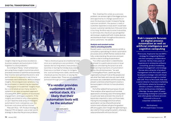 Mazza goes on to add that “ insights must be coordinated across many vendor ' s systems in an open ecosystem approach including RPA , BPM , systems of record and engagement , and legacy systems . If the insights are limited to only a few systems , or can ' t feed the wide array of intelligent automation tools companies use , the business outcomes will be limited .”.