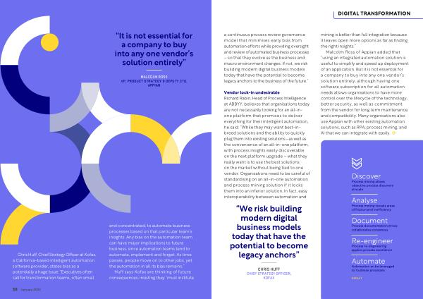 Vendor lock-in undesirable Richard Rabin , Head of Process Intelligence at ABBYY , believes that organisations today are not necessarily looking for an all-inone platform that promises to deliver everything for their intelligent automation , he said : “ While they may want best-inbreed solutions and the ability to quickly plug them into existing solutions – as well as the convenience of an all-in-one platform , with process insights easily discoverable on the next platform upgrade – what they really want is to use the best solutions on the market without being tied to one vendor . Organisations need to be careful of standardising on an all-in-one automation and process mining solution if it locks them into an inferior solution . In fact , easy interoperability between automation and