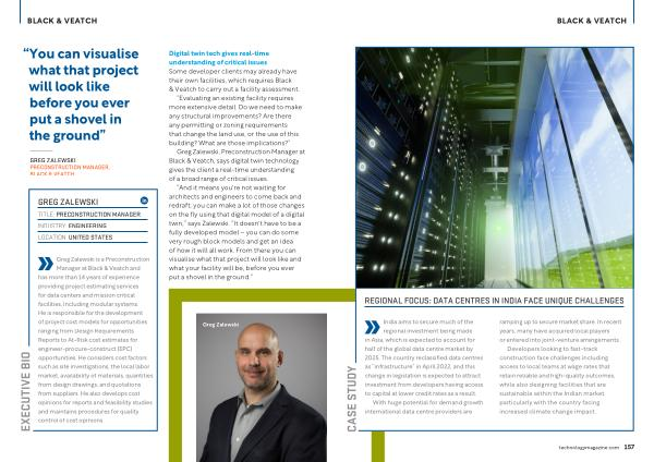 Greg Zalewski , Preconstruction Manager at Black & Veatch , says digital twin technology gives the client a real-time understanding of a broad range of critical issues .