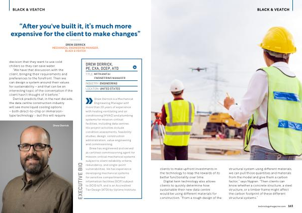 Digital twin technology also allows clients to quickly determine how sustainable their new data centre would be using different materials for construction . “ From a rough design of the structural system using different materials , we can pull those quantities and materials from the model and give them a carbon factor ,” says Nygren . “ Then clients can know whether a concrete structure , a steel structure , or a timber frame might affect the carbon footprint of these different structural systems .” technologymagazine . com 163