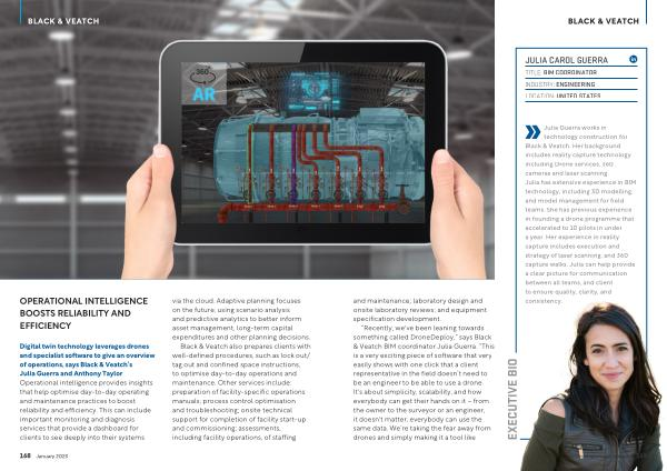 Digital twin technology leverages drones and specialist software to give an overview of operations , says Black & Veatch ’ s Julia Guerra and Anthony Taylor Operational intelligence provides insights that help optimise day-to-day operating and maintenance practices to boost reliability and efficiency . This can include important monitoring and diagnosis services that provide a dashboard for clients to see deeply into their systems via the cloud . Adaptive planning focuses on the future , using scenario analysis and predictive analytics to better inform asset management , long-term capital expenditures and other planning decisions .